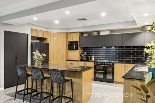 The heart of the home is nothing short of extraordinary. A sprawling open-plan living area unfolds with impeccable design, featuring a show-stopping contemporary kitchen equipped with high-end finishes including a Belling 900mm dual fuel freestanding oven, an ingenious preserving cupboard and sleek, custom cabinetry. This space flows seamlessly into the family and dining areas, where recessed ceilings and expansive windows invite natural light to dance throughout. The impressive family room showcases the highest of tech with a projector and supersized screen plus built-in speakers to immerse yourself in the moment. For those who enjoy entertaining with flair, the games room offers a built-in bar and quirky fittings that create a warm and inviting ambiance.